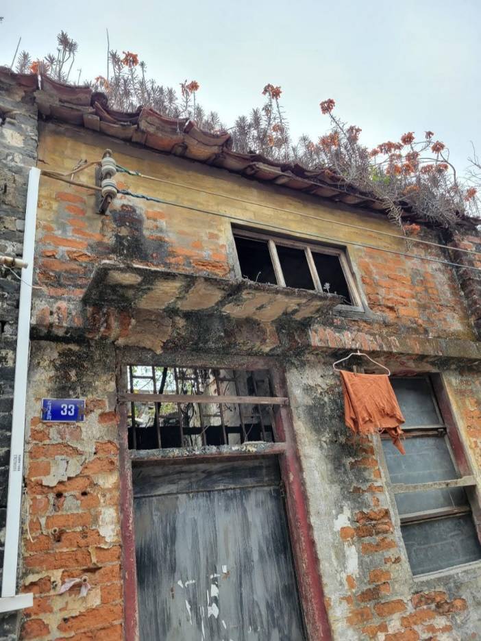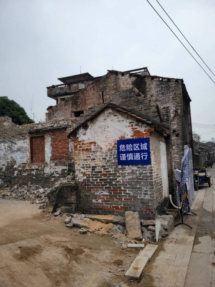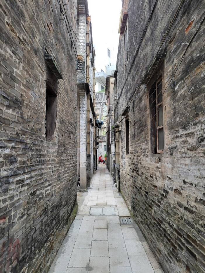 临次要巷道的建筑则多为岭南传统民居样式,高度一般为两三层,高度低于骑楼,且建筑中外来元素较少,有岭南传统镬耳山墙,青砖立面,兼有白色粉墙,遭雨水常年冲刷侵蚀后,呈现出黑色。部分无人居住的房屋墙壁破败,裸露出残破的屋架。