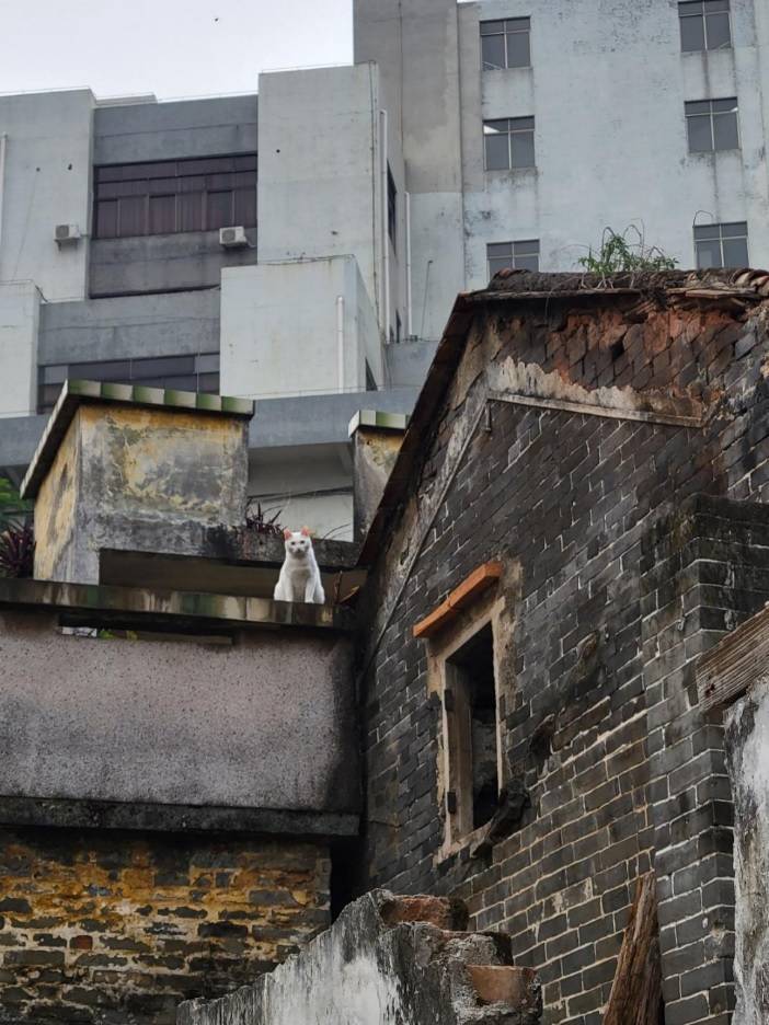 背街小巷的建筑尺度与建筑风格都与主要道路不同,大多并未作为商铺营业,部分房屋已成废墟,猫穿行于屋宇之上。蔡炯昊摄。