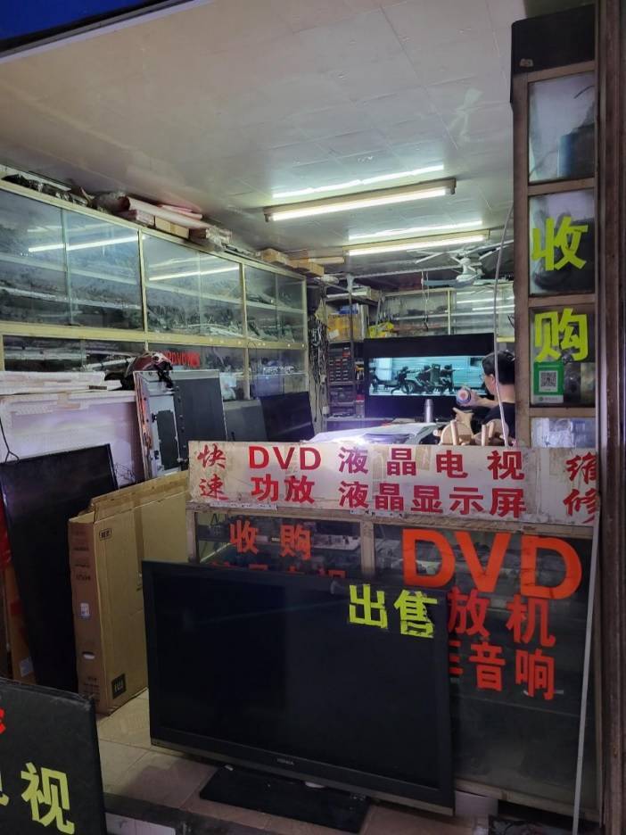 与弹琴的老板门面相隔不远,同样是门可罗雀的电子产品店之中,老板自己用设备看起了早年的香港警匪片。紧凑的配乐和激烈的枪战声,似乎在彰显所出售设备的质量可靠,同时也成为一个逝去不远时代的挽歌。