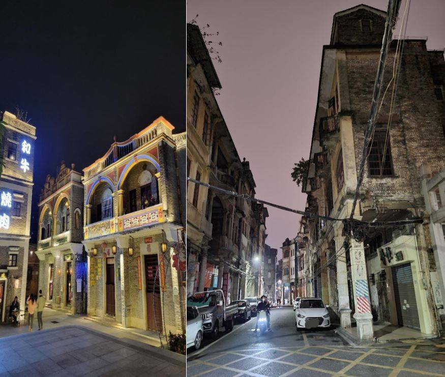 迪士尼化之后的街区景观与未经统一改造的相邻街区在入夜之后形成鲜明的对比。蔡炯昊摄。