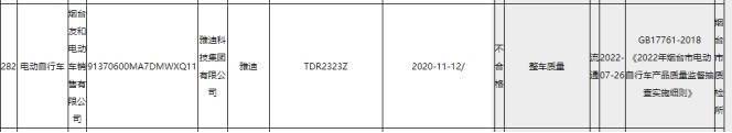 1批次由上海钧哈网络科技有限公司生产的“棒途”电动自行车不合格。其不合格项目为鞍座长度;规格型号为TDT2103Z车辆编码:120322202000844;生产(进货)日期/批号为2022-02-13;抽样日期为2022-06-23;被抽查企业为莱山区麒麟电动车行。检验依据为GB17761-2018《2022年烟台市电动自行车产品质量监督抽查实施细则》,承检机构为烟台市质检所。