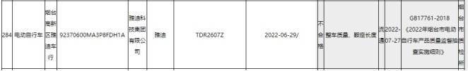 1批次由浙江绿源电动车有限公司生产的“绿源”电动自行车不合格。其不合格项目为鞍座长度;规格型号为TDT2167Z整车编码:192822202502924;生产(进货)日期/批号为2022-05-26;抽样日期为2022-05-26;被抽查企业为福山区清洋萧剑电动车店。检验依据为GB17761-2018《2022年烟台市电动自行车产品质量监督抽查实施细则》,承检机构为烟台市质检所。