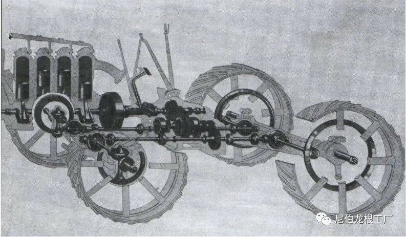 奥地利-戴姆勒M17炮兵牵引车的传动系统结构示意图,斯柯达RSO的传动系统与其非常接近。