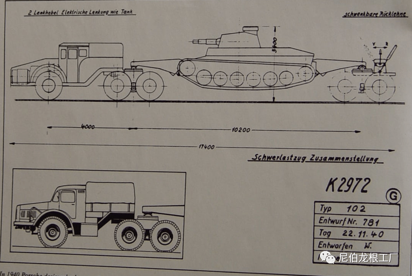 除了斯太尔-戴姆勒-普赫公司之外,武器局还邀请了位于斯图加特的保时捷公司为他们设计了一个备选方案。公司主脑费迪南德·保时捷博士很受希特勒的信任,所以在1942年4月的时候,希特勒直截了当地向保时捷提出了他到底想要个什么玩意——这位奥地利代理下士对战争的很多认知还停留在一战时期,那时候他可能在战场上看过大轮炮兵牵引车,所以,他想要的是一种装了四个大直径钢制车轮,只能低速行驶,牵引力强劲,结构粗陋的车辆。好巧不巧,奥匈帝国在一战期间用来牵引斯柯达重炮的奥地利-戴姆勒M16炮兵发电车,以及机械驱动的M17炮兵牵引车差不多就是这个样子,而保时捷也恰好是它们的设计师。