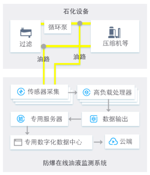 由于石油化工行业的生产过程中使用大量的液态和气态石油产品,这些产品的泄漏和积聚可能会导致爆炸和火灾等重大安全事故。基于防爆型在线油液监测解决方案可以有效保障石油化工行业设备运行健康。因此需要对其设备油品状态进行实时监测。