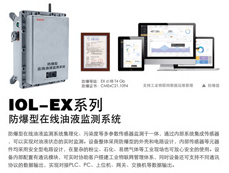 防爆型在线油液监测系统整机采用防爆设计,提供I/II类防爆要求的产品,符合在粉尘,易燃易爆等环境安装适用。产品在数据传输上提供有线和无线传输的方式,可快速对接终端现场的数据链路,同时设备内部的传感器针对石化行业的特殊应用,在高压力或者低压力等油路上均可实现自由应用。