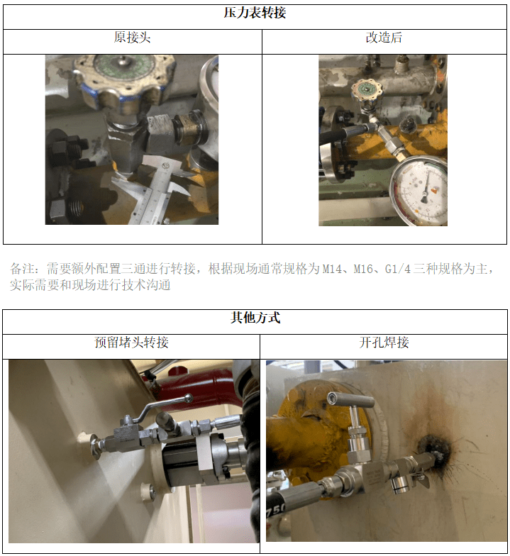 在需要监测的设备上选择合适的取/回油口,是在线油液监测系统安装成败的关键;通常我们需要选择过滤器之前,管路压力合适(3bar≤取油管路压力≤20bar)的位置开孔焊接取油接头或在现有的孔位、仪表加装转接头与取油管路链接;回油口的选择一般选择在储油箱或润滑系统连接油箱的回油管(回油管路压力≤1bar)焊接取油接头或在现有的孔位、仪表加装转接头与回油管路链接。