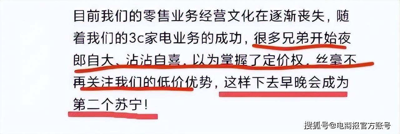 “随着我们的3C家电业务成功,很多兄弟开始夜郎自大、沾沾自喜,以为掌握了定价权,丝毫不再关注低价优势,这样下去早晚会成为第二个苏宁!”