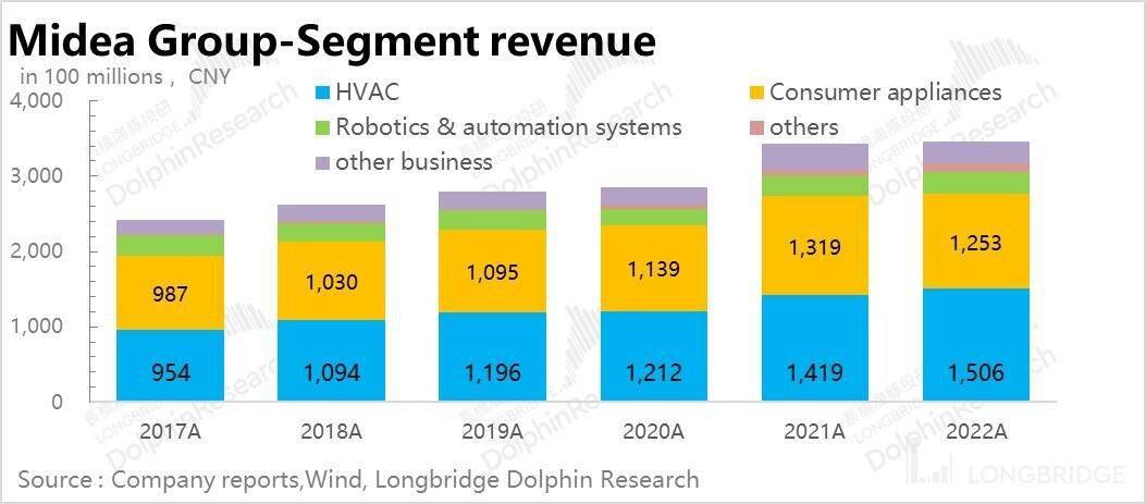 2.业务分散抗周期:由于美的集团和格力电器发展的业务领域已经有比较明显的差异,所以直接做比较不是特别合适。但是比较显而易见的是,美的集团由于业务较为分散,因此受到单项业务的拖累要更小一些。
