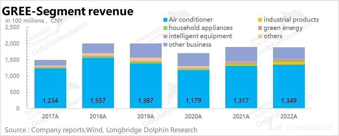 格力的业务目前仍然主要聚焦在空调(占比达到 70%),虽然公司也有工业制品和生活电器业务,但整体占比太小对公司影响不大。因此,公司整体的增长中枢还是由空调业务决定(去年空调业务增长 2.4%)。