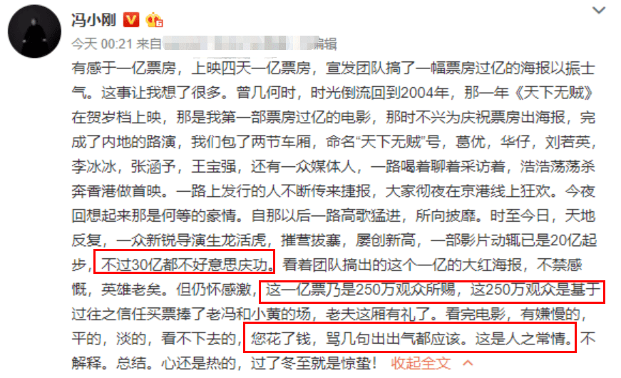他一边自嘲如今没有30亿的票房都不好意思说出来,但他依然为了过亿的票房而高兴。另一方面,他谦虚地感谢为《只有芸知道》贡献票房的250万观众,还说观众花了钱,骂两句是应该的。