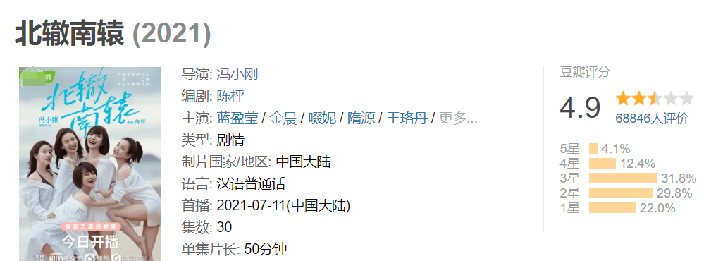 2021年,冯小刚纾尊降贵拍了电视剧《北辙南辕》,拍的还是大热题材“女子群像”,但因为台词过于“悬浮”,遭来了观众吐槽一片,最后在某平台只有4.9分的评分,连及格线都不到。