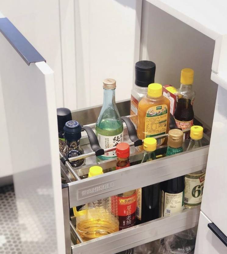 更不方便的是,拉篮固定了收纳瓶的尺寸,一些不符合尺寸大小的,还是放不进去。拉篮使用久了,对五金件也是一个考验,每天做饭打开关闭,时间久了还会导致抽拉不顺畅的情况。