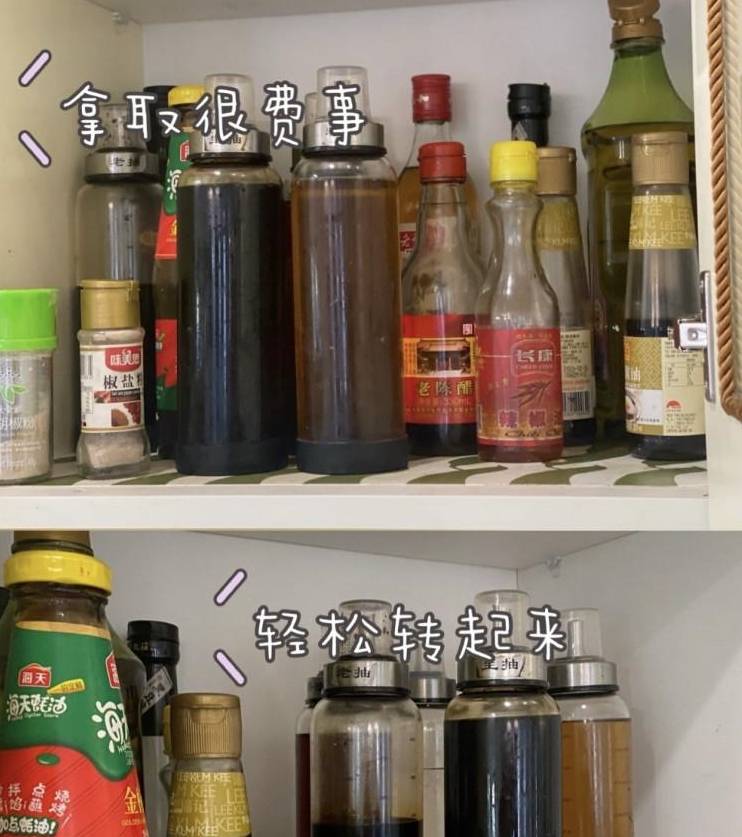 常用调味品收纳,不如直接放入柜内或者台面上,通过一个旋转收纳盘来搞定。这样拿取的时候,转一下就能拿到,放回也更轻松。