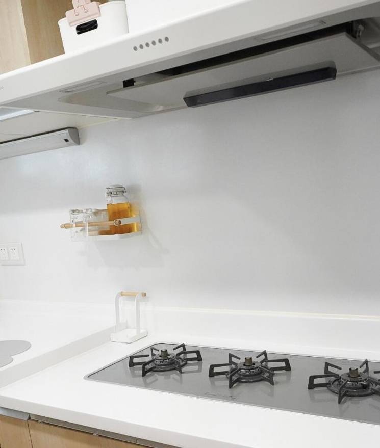 灶台前墙面可以安装日式的珐琅板,防油防污,做完饭轻轻一擦,全都干干净净。