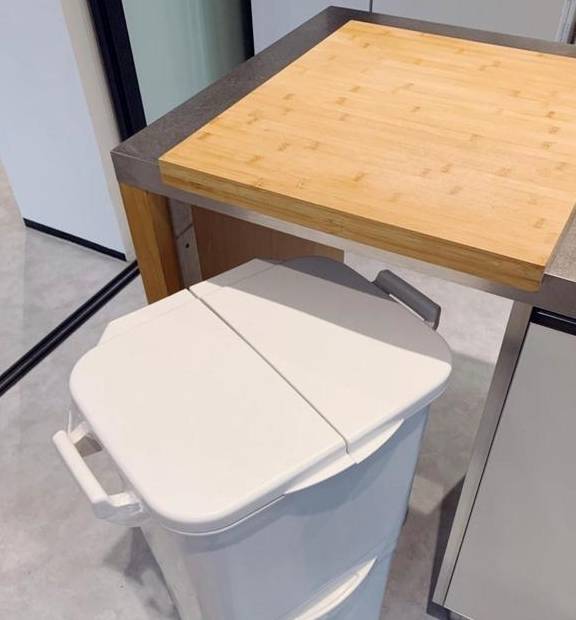 用来放置分类垃圾桶,平时丢垃圾方便,做完饭推入台面下,还能隐身,让厨房看起来也清爽很多。