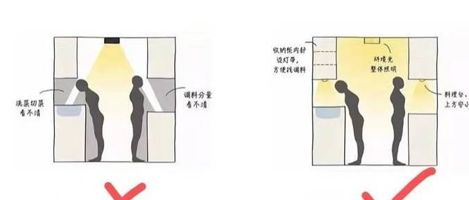 而实际上,厨房吊顶的灯再多,只要人站在台面前,总有会部分是被人体阴影遮挡,而造成眼前区域不清晰的感觉。
