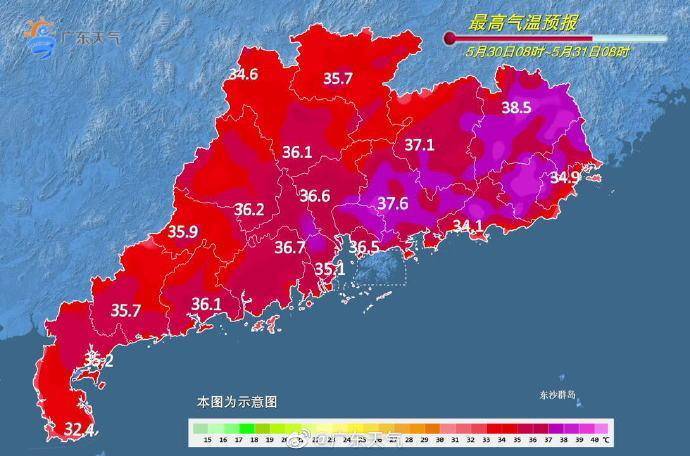 @广东天气预计,30日广东中北部市县有大范围的35℃~37℃高温,局地可达38℃或39℃,31日至6月1日,广东省仍有35℃及以上高温,但午后雷阵雨将趋频繁,局地雨势较大,雷雨时伴有短时大风、雷电等对流性天气。