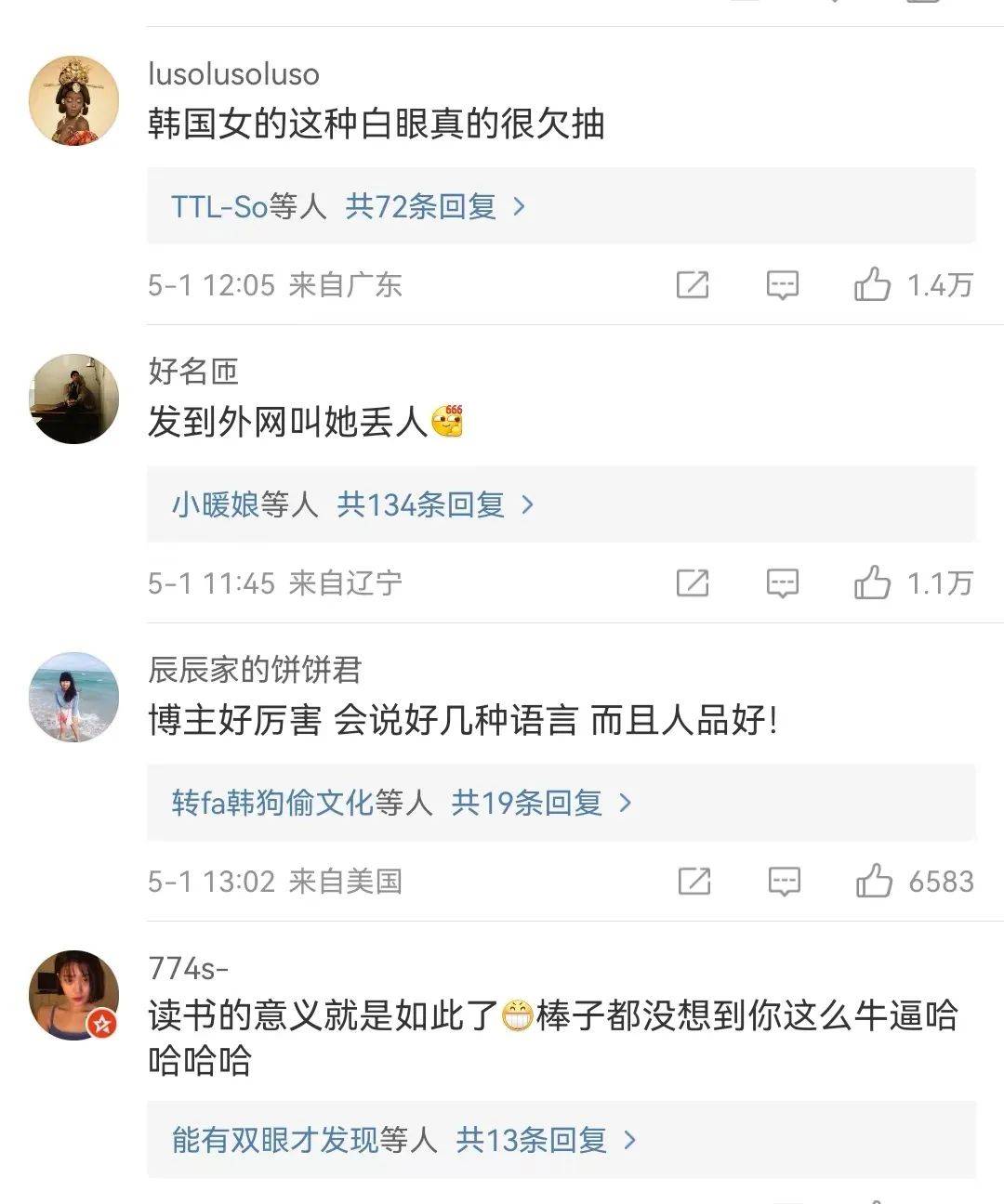 评论区里,除了diss韩国人没素质的言论外,许多网友也对博主自如切换四国语言的牛逼行为表示佩服。