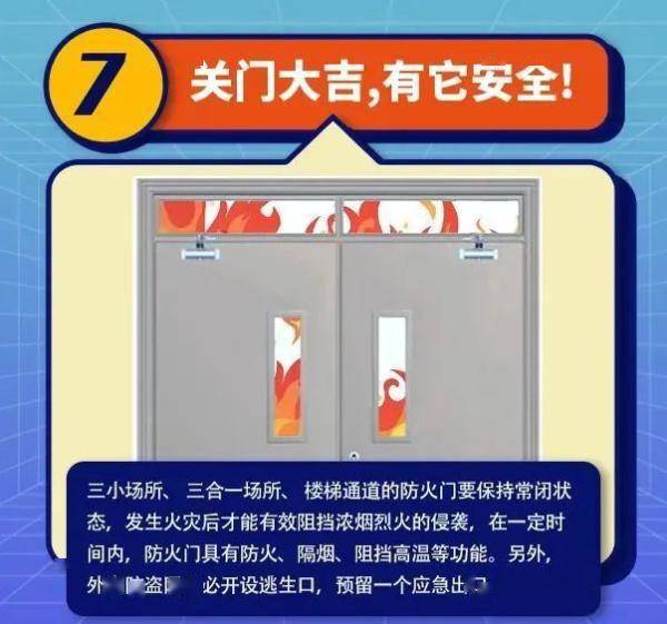 五是常闭防火门长期处于开启状态。防火门设置在楼梯口和前室,是阻止火势蔓延和烟气扩散的屏障。一旦处于开启状态,将成为浓烟和火灾蔓延通道,成夺命通道。