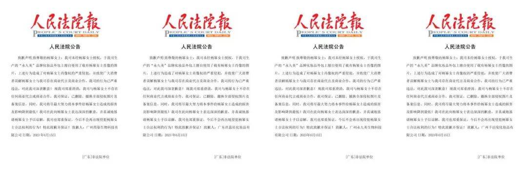 如本月,杨幂收到了包括广州永九美生物科技有限公司(下称:广州永久美)、广东丝蕊社化妆品有限公司等四家企业的道歉信。