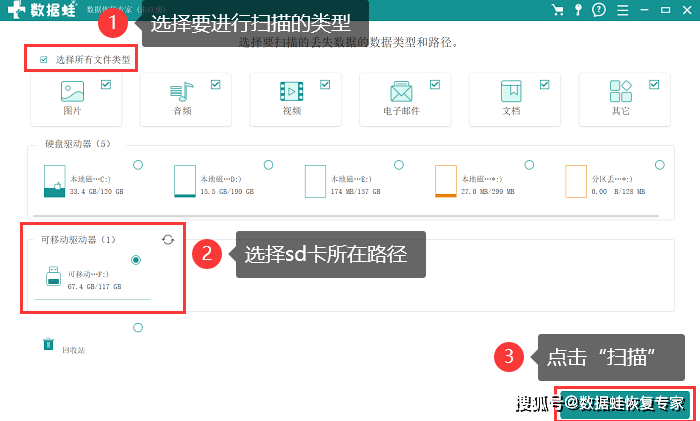 且其支持恢复的数据不仅是sd卡中的数据,像优盘、移动硬盘、硬盘等各种存储设备中的数据恢复也是支持的。其操作步骤较为简单,以下是软件的操作方法: