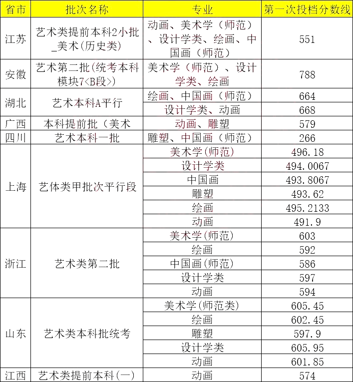 采用非平行志愿投档模式的(如全部投档)省份,美术与设计学类专业折算总分=文化成绩/文化满分*500+专业成绩/专业满分*500