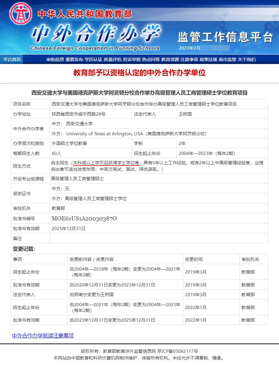 2004年,西安交通大学与美国德克萨斯大学阿灵顿分校合作举办高级管理人员工商管理硕士(EMBA)学位教育项目获得国家教育部批准。本项目已经运行近20年,共招收各类机构高级管理人员逾2000名,在国内外形成了广泛的影响力,获得了业界高度赞许。