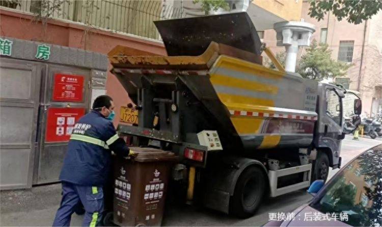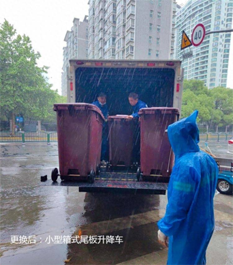 “以桶换桶”模式与传统模式最大的区别,就是将后装式垃圾车更替为厢式平板升降车。后装式垃圾车需要人工将垃圾桶拖挂到装料斗后方的装置上,再使用机械装置抬升垃圾桶倾倒垃圾,过程中垃圾桶与车体不断碰撞,会产生频繁的噪音,清晨清运时易影响周边居民休息,倾倒湿垃圾时也很容易渗液滴漏污染地面,影响周边环境。