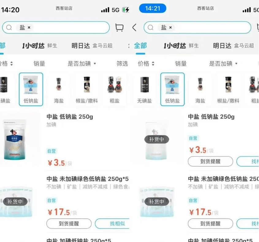 8月24日中午,记者查看生鲜电商平台发现,多个平台的低钠盐、无碘盐显示“缺货” “补货中”。