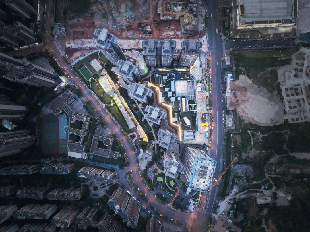 40层的超高层办公塔楼位于用地南侧大渌岭路口,与商业共同构成主要城市展示面;8栋高层住宅围绕商业核心,在西侧依次展开;位于建筑群后方的城市绿地,则是500米进深的智慧体育公园。