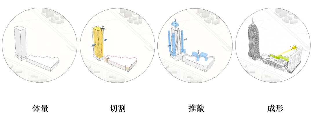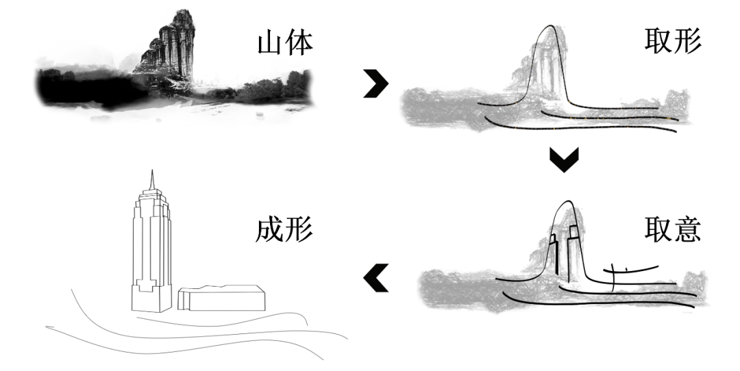 项目构思以城市脉络为意、山水为形,形成建筑的基本形态,再以“进退,切割,变形”等设计手法形成最终的体量,既有诗意,又兼具现代气息。