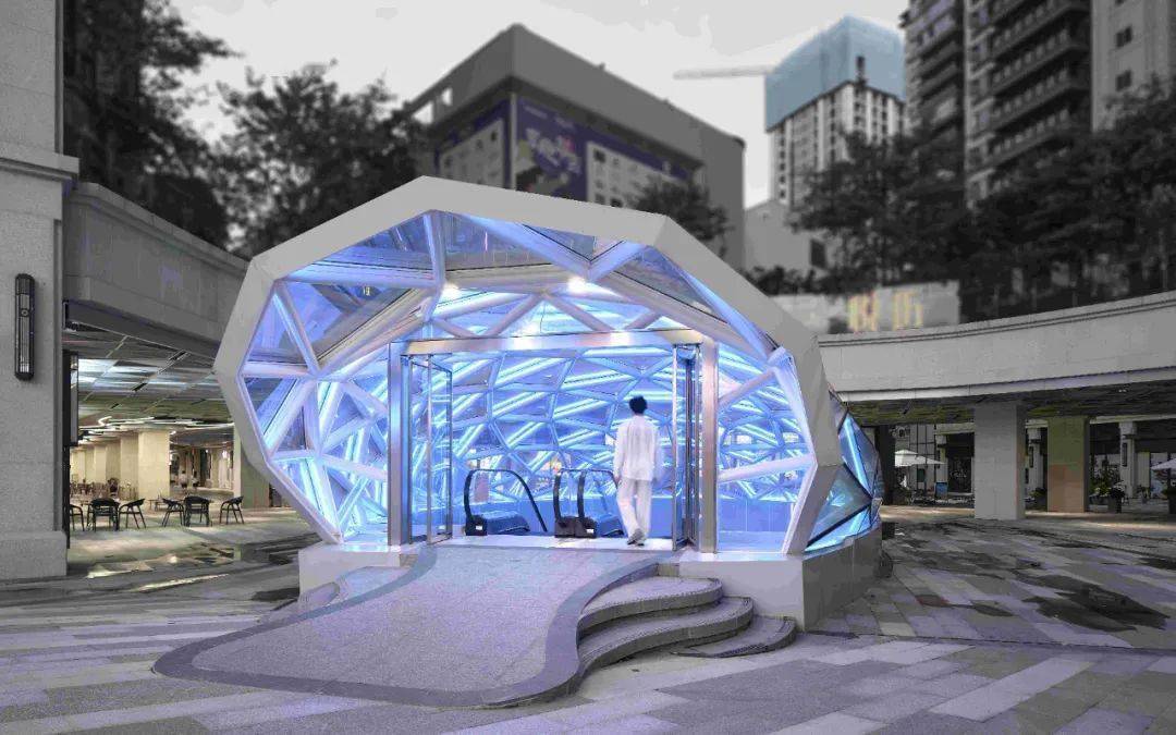 主入口以竖向框体为基础,内部采用多角度的折形玻璃拼接,打造出宛如钻石切面的立体造型,使其成为整个商业最吸引眼球的城市展示面和人流汇集点。