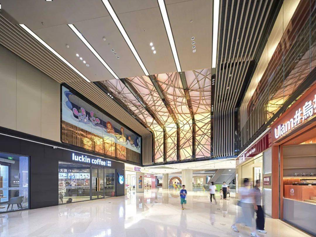 立面延伸进入建筑内部,形成风格统一的室内装饰,将内外空间的商业氛围连成一体。