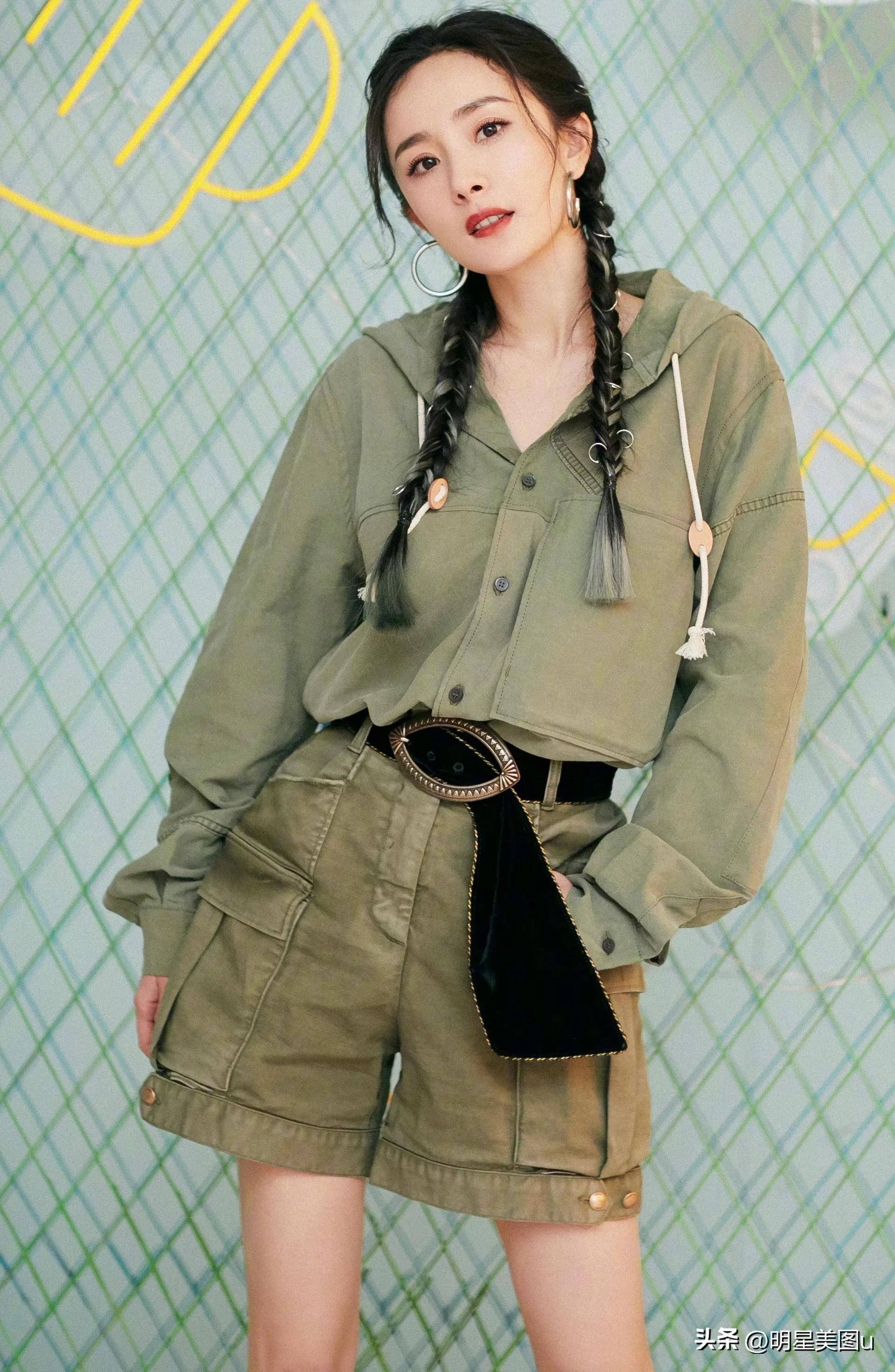 第一套,杨幂女神身穿绿色外套搭配绿色短裤,脚踩黑色高跟凉鞋。
