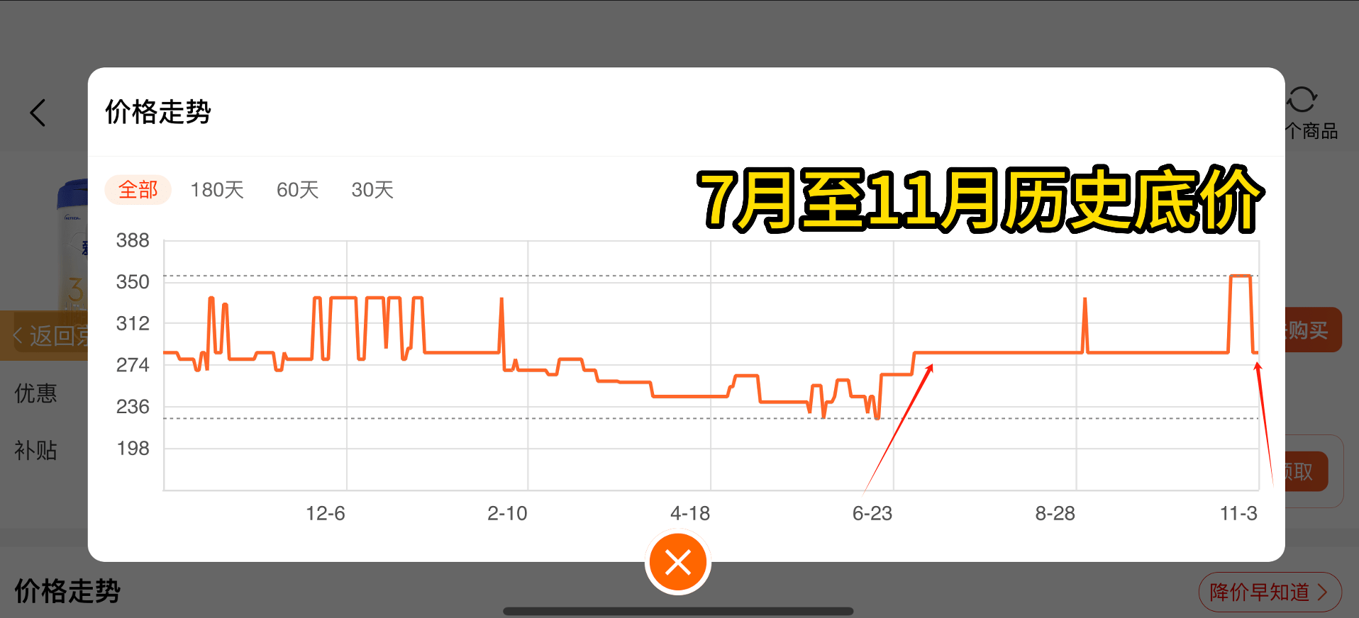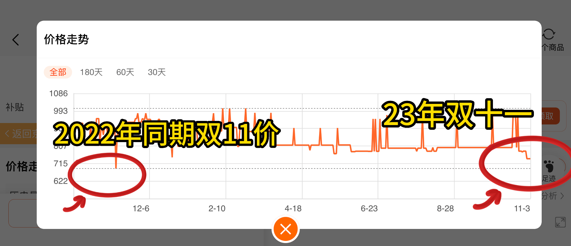 我们通过“慢慢买App”提供的价格走势图,用双11价,对比618价、30天底价 60天底价、去年同期底价及其他维度得出以上结论!