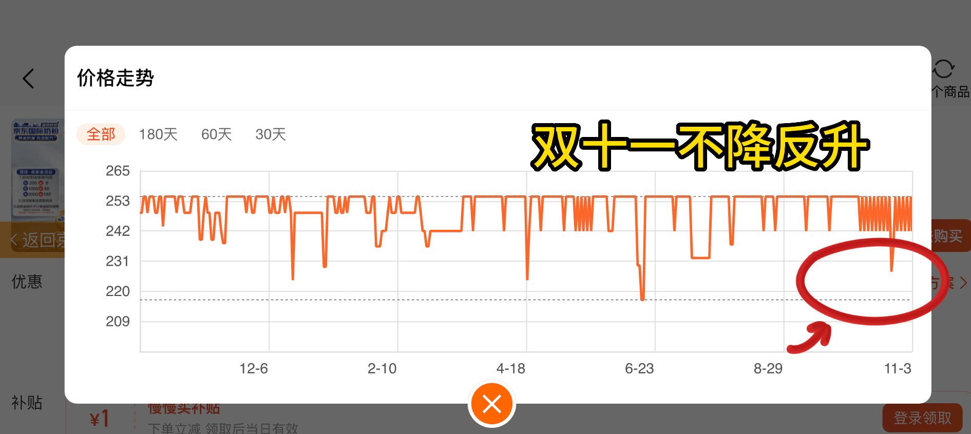 另外甚至爱他美白金版,经典版蓝罐等,双11价格比近30天底价还要高出28多,这不典型的双11不降价还涨价吗?