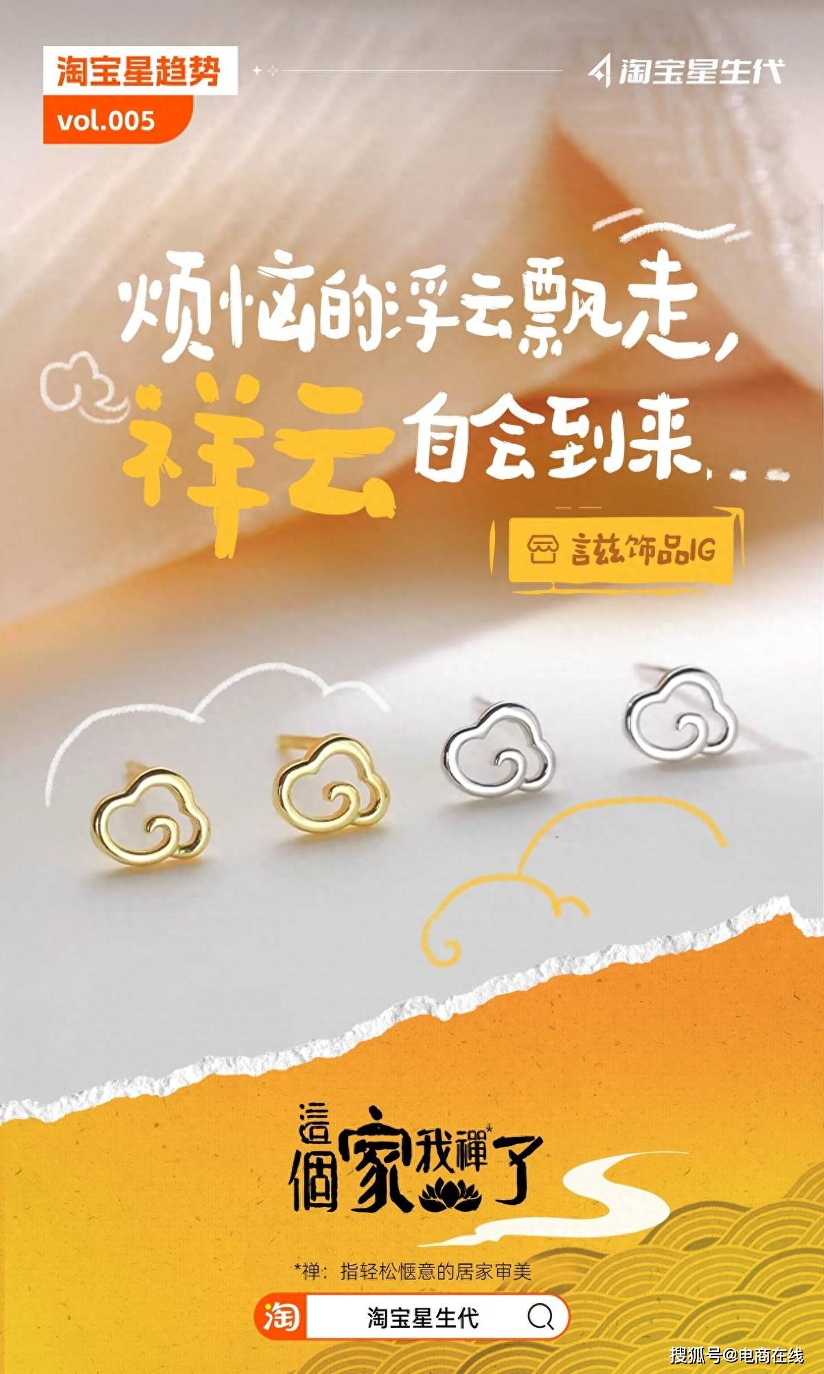 同时,淘宝星生代百万新商造星计划还洞察到各类经济趋势增长及社会热点,为“言兹饰品IG”这类特色品类中小商家进行店铺精准曝光,在淘宝上线了“这个家,我‘禅’了”活动会场,店铺中物美价廉的首饰为18到25周岁年龄段年轻人提供不同选择。用户打开淘宝,进入淘宝星生代百万新商造星计划“这个家,我‘禅’了”活动页面,可以看到“言兹饰品IG”的耳钉。