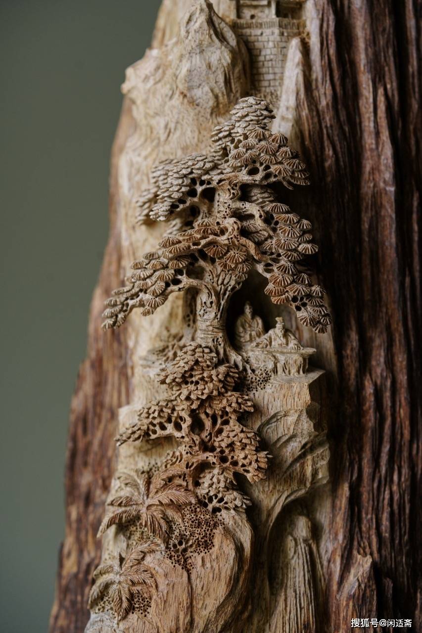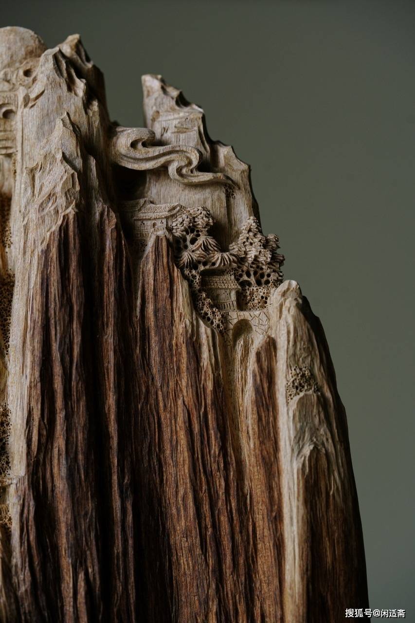 作品由一位技艺超群的工匠根据天然的形状设计而成,他巧妙地利用木材的纹理和质地,以微雕技法雕刻,将山林奇景栩栩如生地呈现在我们眼前。在雕刻过程中,工匠对每一个细节都严谨入微,从山峰的耸峙到草木的繁盛,从松柏的依稀到亭台楼阁的隐匿,每一样都刻画得栩栩如生,仿佛让人置身于那深山访友,坐而与知音对谈的胜境之中。在淡淡的幽香中,雅人深致,意境幽远,让人心旷神怡。