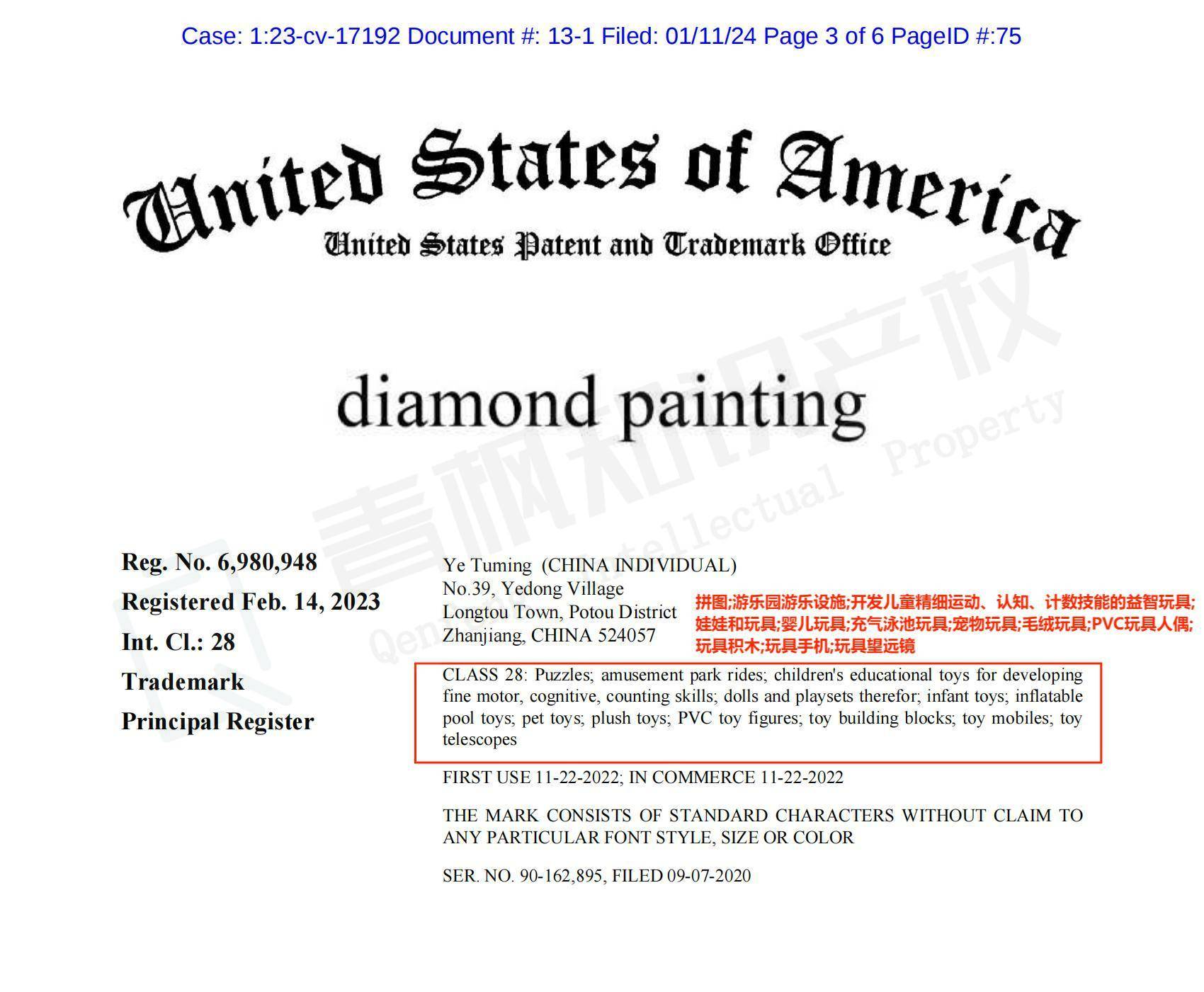 Q:钻石画不是美术类产品吗?原告注册的是玩具健身类,这样也会被提告?