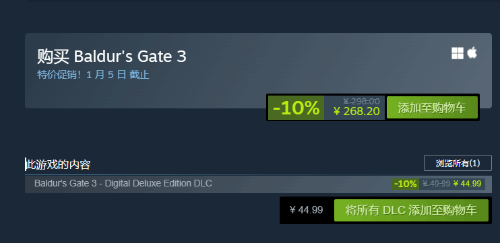 这款游戏在Steam上的售价为268.20元,折扣率为10%,活动时间为1月4日。除此之外,《博德之门3》也在GOG平台上开启了同样的10% Off折扣,活动时间为1月4日;同时,PS商店也推出了10% Off的优惠,但仅持续到1月3日。
