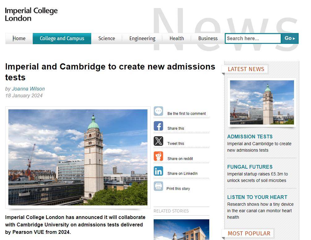 帝国理工学院宣布,将与剑桥大学合作,从2024年开始通过Pearson VUE提供2项入学考试。