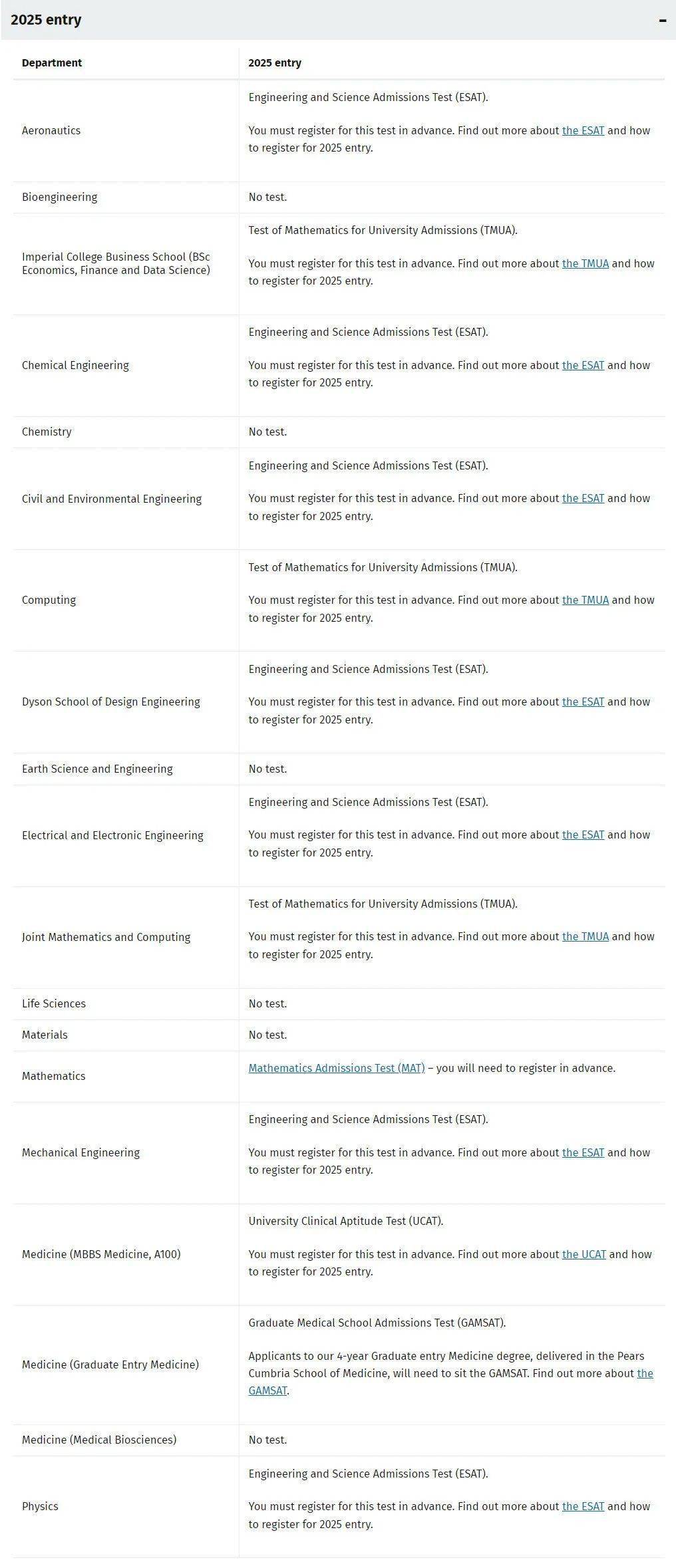 不得了!!!我们点进帝国理工入学考试的相关页面,发现也有大改。按照2025 entry入学笔试的不同要求,把我大IC的department分为了4类:
