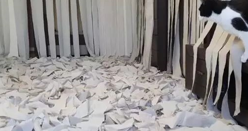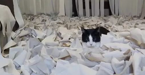 “Pusic总共玩了大概30分钟。”他们说,“起初它真的懵了,看着这么多的卫生纸突然不知道该怎么办了,大概过了2分钟,乐趣才刚刚开始!”