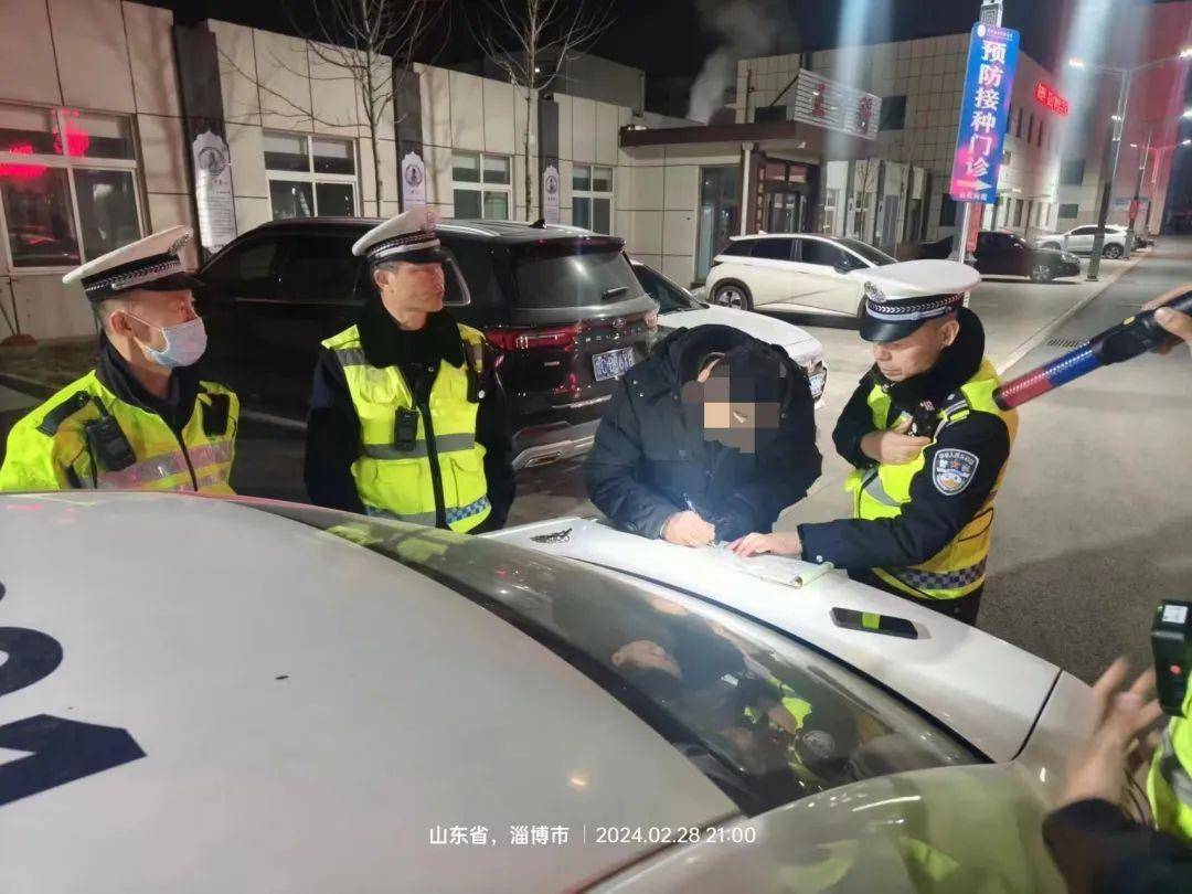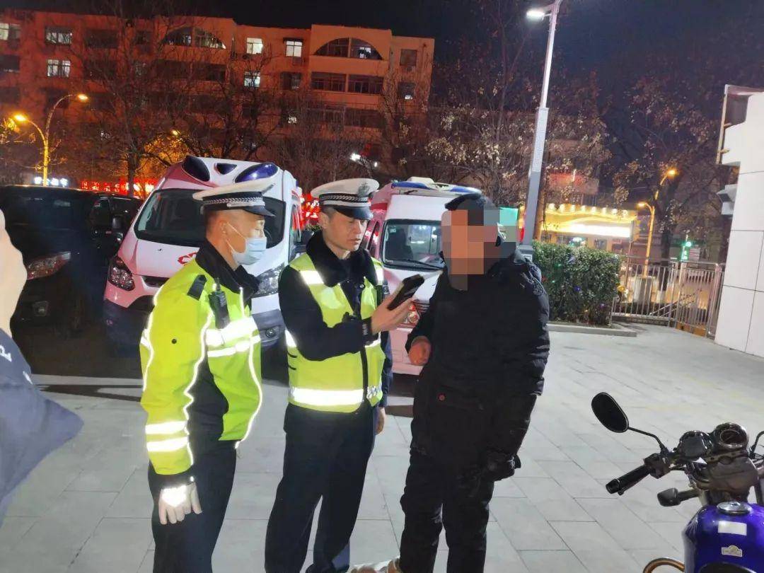 2月29日晚上9:30许,淄博周村交警正在长行街棉花市街路口例行酒驾检查,一辆从东向西行驶的二轮摩托车快到检查点时突然左拐进了路边一家医院,民警随即跟上对驾驶员和车辆进行检查。