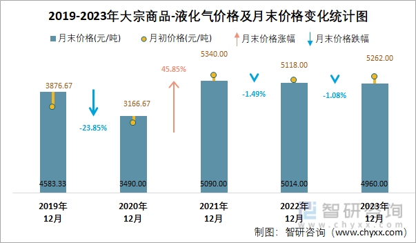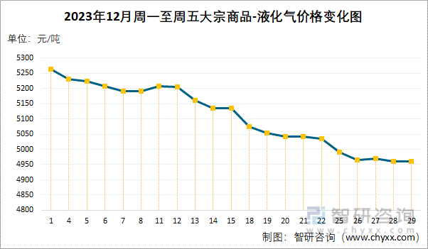 据生意社大宗榜数据统计可知:2023年12月能源大宗商品液化气价格为4960元/吨,同比下降1.08%,环比下降5.74%;从12月周一至周五大宗商品液化气价格来看,价格在4960-5262元/吨之间波动,12月1日达到最大值。