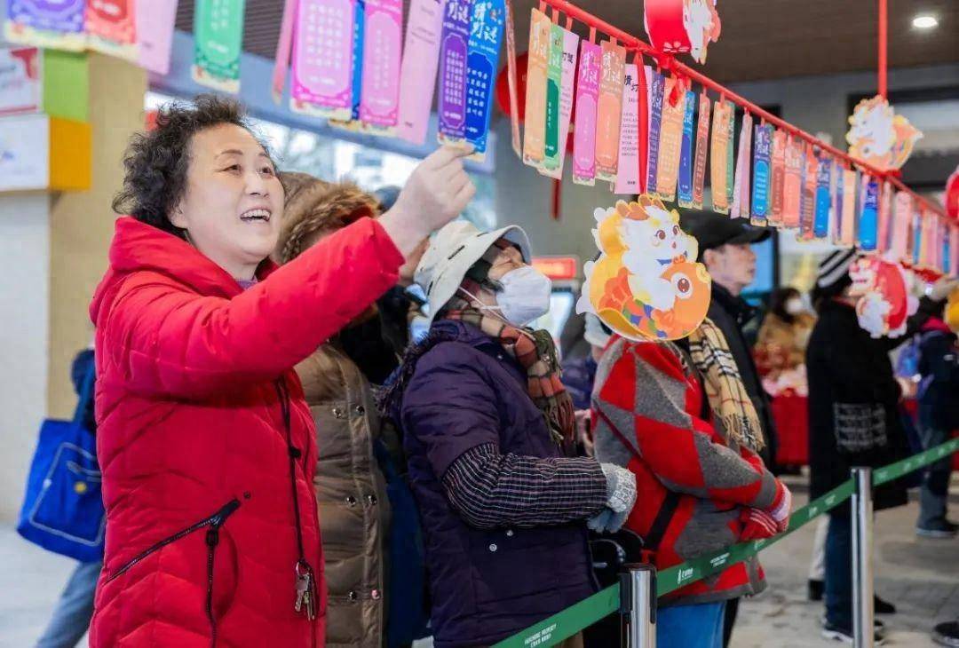 康健街道党群服务中心外场活动区,百余条色彩各异的灯谜迎风飘扬,灯谜种类繁多,生动有趣,不少居民在此驻足。一位老先生早早来到猜灯谜现场,他表示:“这样的活动形式非常好,猜灯谜讲究的就是一种氛围,值得延续。”除传统形式的谜题外,本次猜灯谜活动还特设党史学习知识问答,居民们热情高涨,在解谜过程中互相交流,灯谜区年味十足。