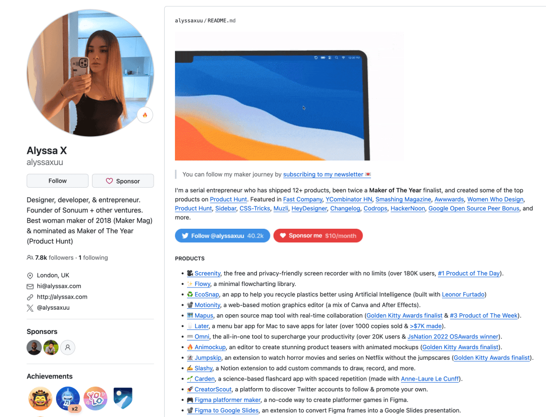 噢更绝的是,插件的开发者还是位开发技术一流的妹子,叫 Alyssa X ,拿过 2 次的 ProductHunt 年度开发者。