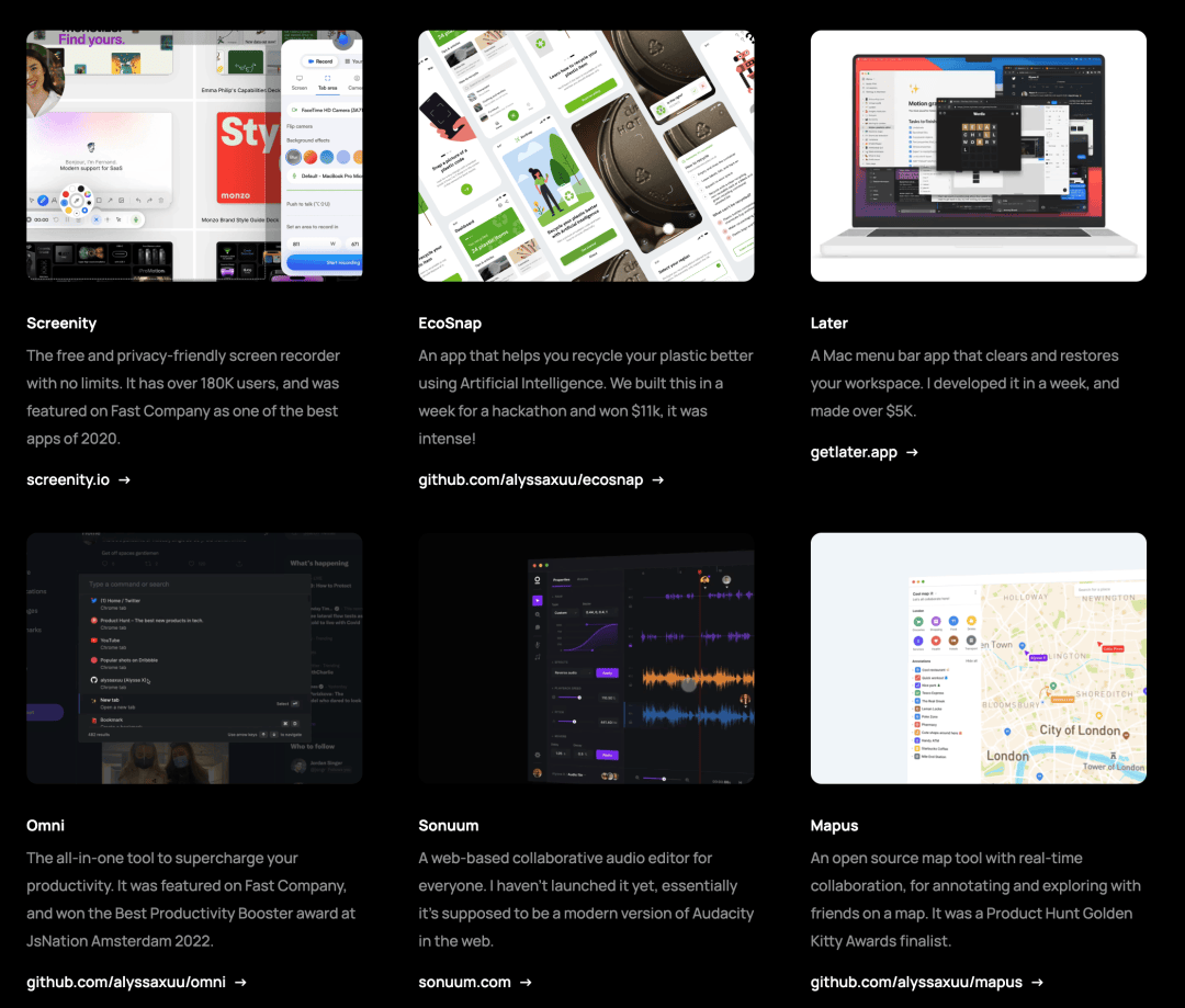 涉猎范围包括 Mac 效率工具、Figma 扩展,谷歌插件,其中有 2 款入围过 Product Hunt Golden Kitty Awards 年度最佳产品评选的决赛。