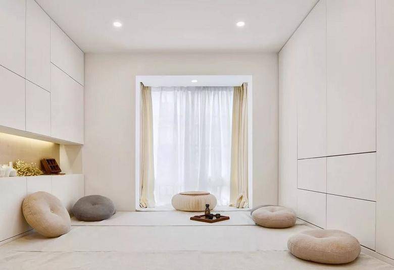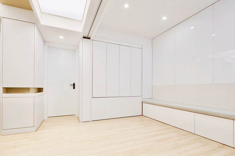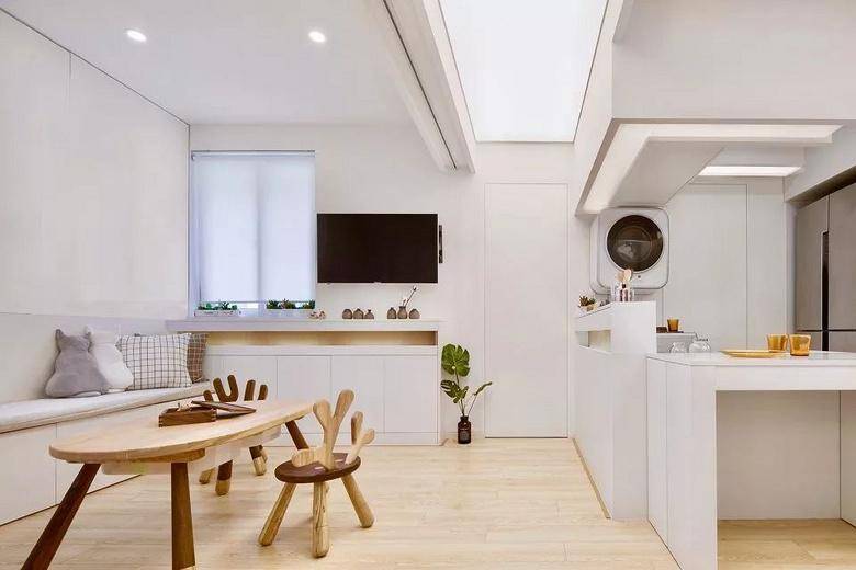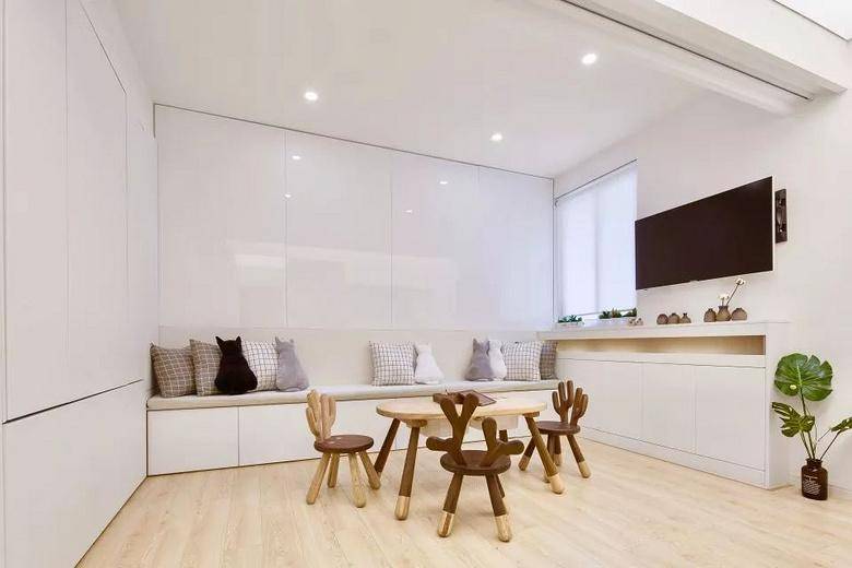 您看到客厅里的白墙白瓦,实际上全是隐藏空间的柜子。设计人员甚至在卡座下面也预留了储物空间。